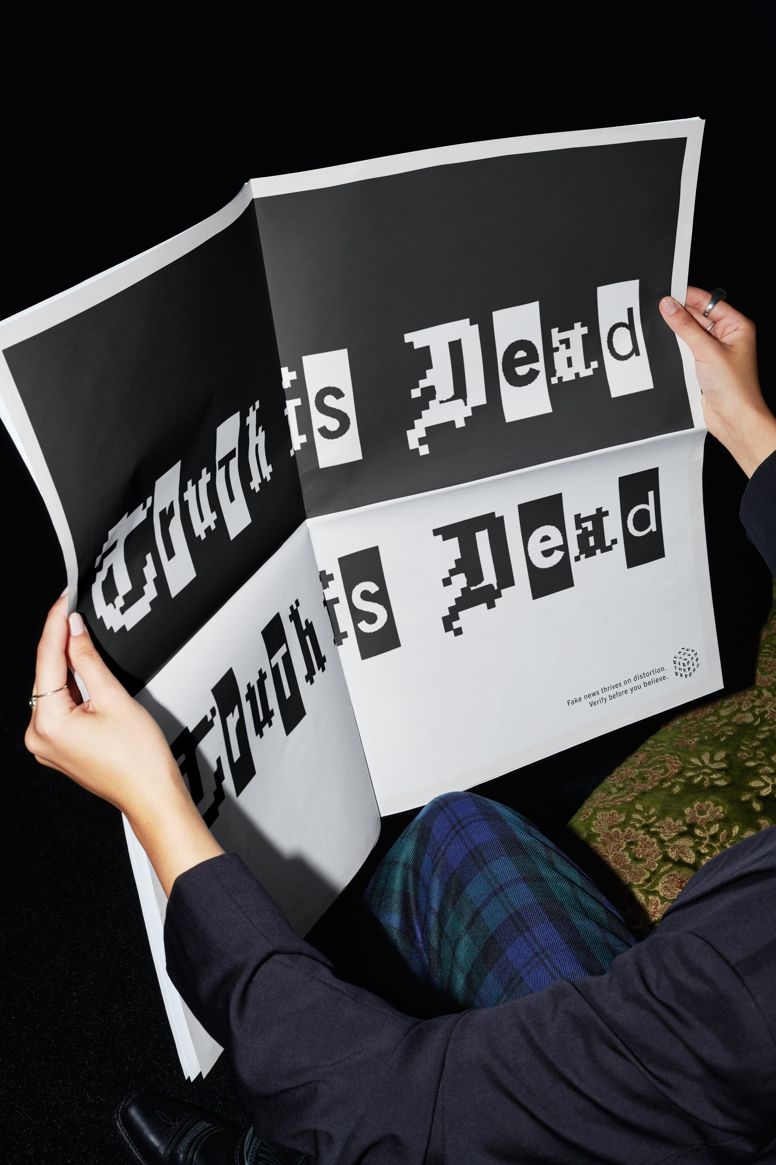 A campaign for a dynamic typographic cube that shifts and distorts, visualising the ongoing tug of truth.